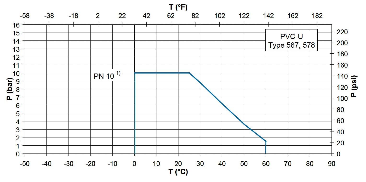 The following pressure-temperature diagram is based on a lifetime of 25 years and water or similar media